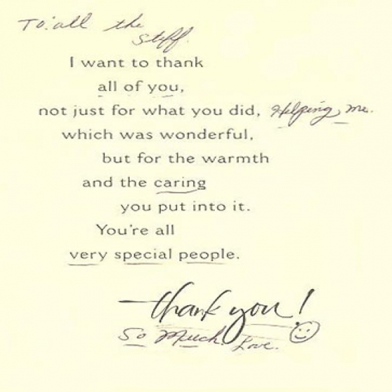 To your staff – my gratitude for always being kind and patient with me when I called in (sometimes every day).