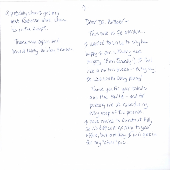 Thank you for your talents and mad skillz…and for putting me at ease during every step of the process. I have moved to Chestnut Hill, so it’s difficult getting to your office, but one day I will get in for my “after” pic. Probably when I get my next Radiesse shot, when it’s in the budget.