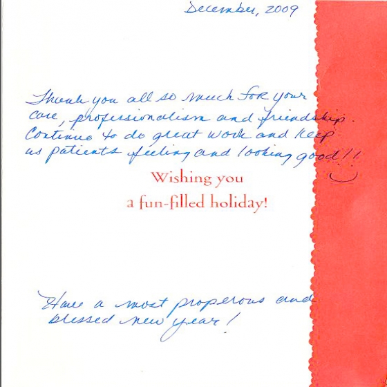 I just wanted to say thank you for all you have done for me. I think it has been almost six years and each time I leave your office I feel great! You are truly a wonderful doctor, as well as a good person and I count myself lucky to have been brought to you.