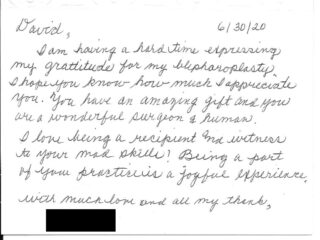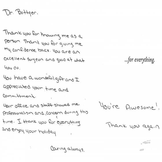 Thank you for knowing me as a person. Thank you for giving me my confidence back. You are an excellent surgeon and good at what you do.